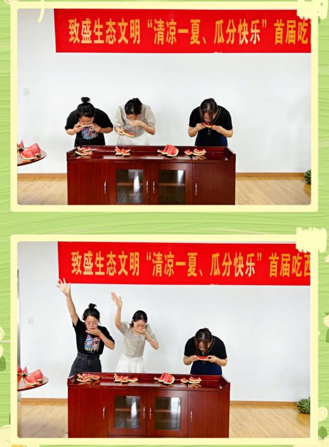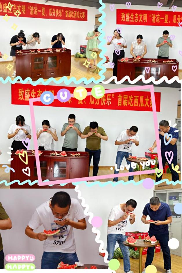 欢声笑语、其乐融融。通过举办这次吃西瓜比赛,加强了同事间的沟通,增进了彼此的感情,活跃了文化氛围。在丰富员工业余生活的同时也在炎热的夏季为大家带来一份清凉。今后,致盛生态文明会有更多丰富多彩的员工文化活动,期待更多的小伙伴们参与并大放异彩!